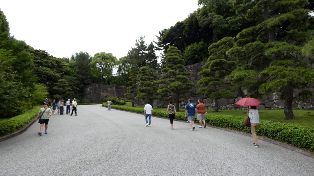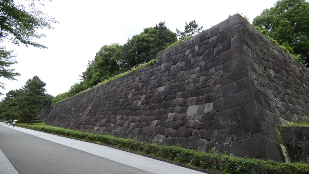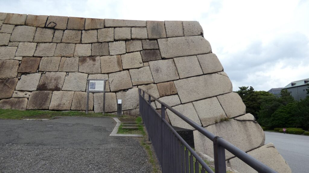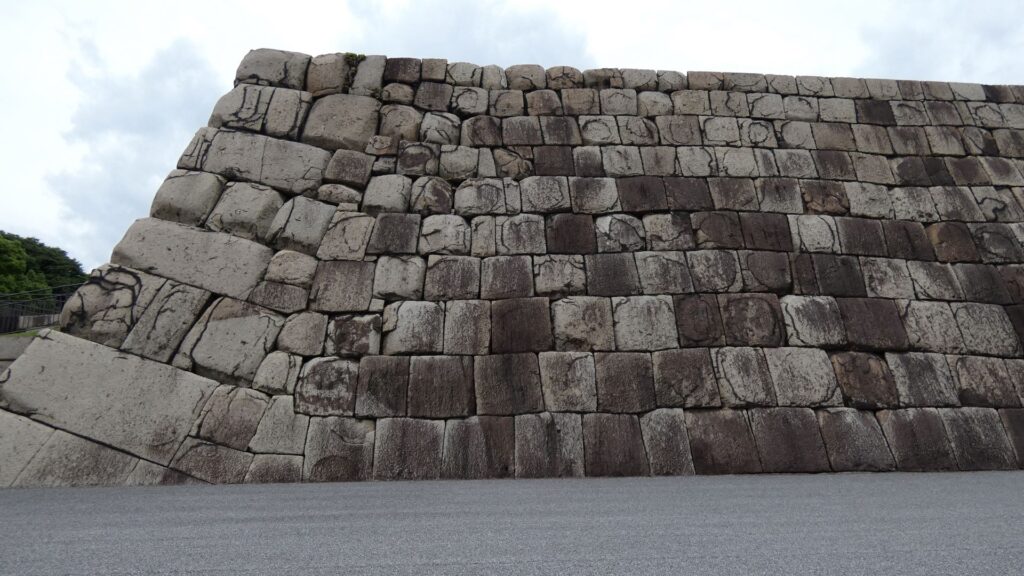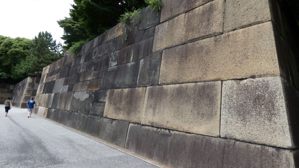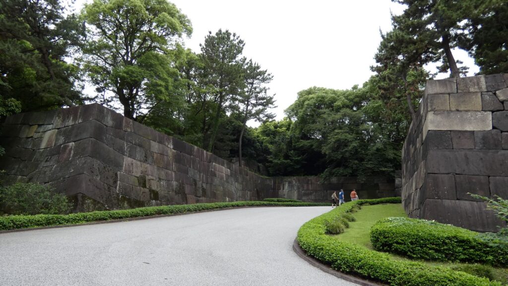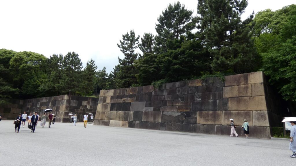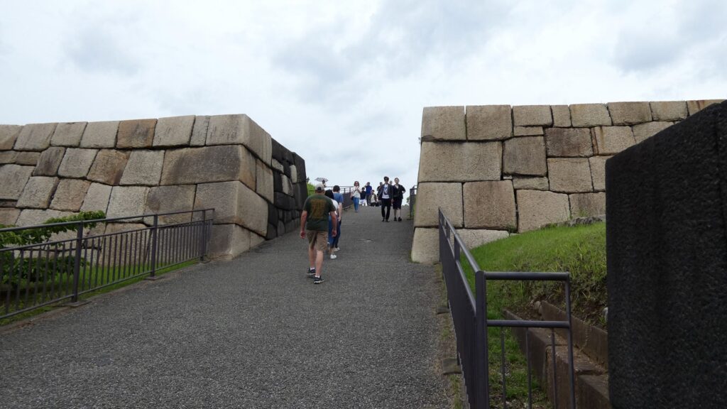 百人番所の反対側へ振り返ると、すごい石垣があります。中の門跡です。古写真で見たときも大きいと思いましたが、建物がなくても十分わかります。見せる石垣です。この石垣は、明暦の大火や、元禄時代の地震の後に修復されたものです。白っぽい石も多くて、それに精密に積まれています。石は、伊豆半島からだけではなく、西日本から花こう岩が集められました。色の違いは、石の種類が多いからでしょうし、精密さは時代の進化なのでしょう。それに、石積みは町人にも依頼されたそうです。そのころには幕府も安定し、町人も力をつけていたのです。この門は枡形ではありませんが、その頃には門の目的が、防衛より権威に移っていたのでしょう。