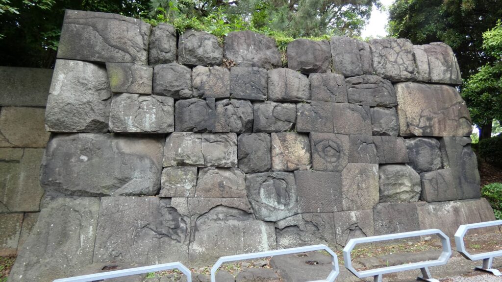 下った所にある梅林坂と汐見坂の間にある石垣は、随分精密に積まれています。この辺の石垣は、江戸時代以来、地震などで何度も修復されているので、「切り込みハギ」「すだれはつり」など新しい技法が使われています。