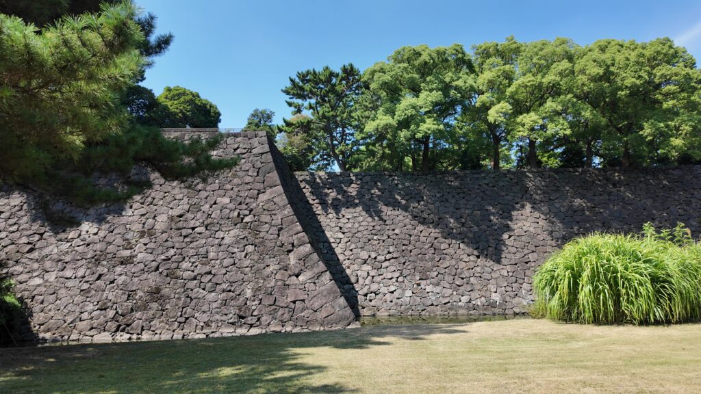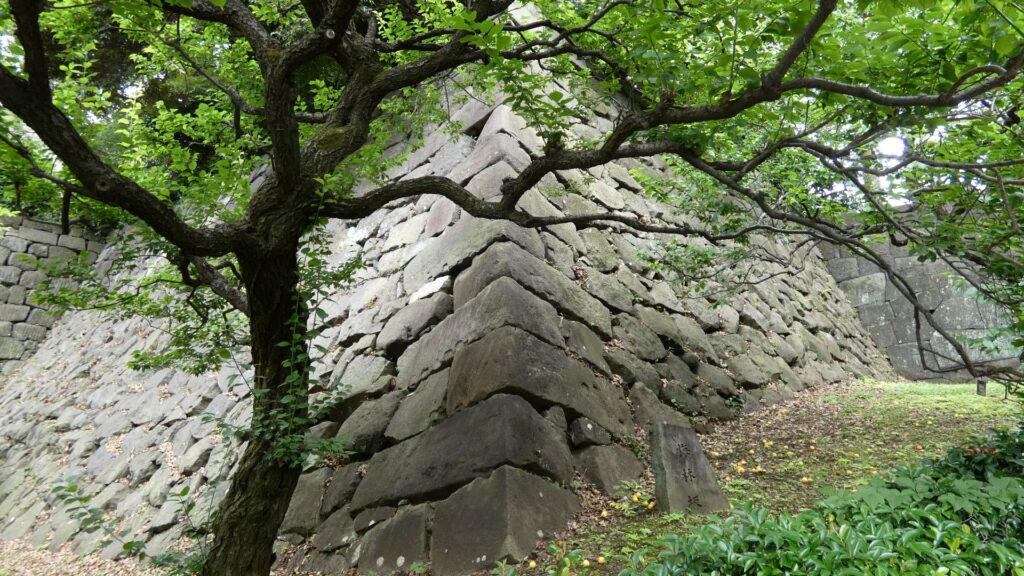 白鳥濠の石垣を下から眺めましょう。上のところは、先ほど行った展望台です。石垣のラインもきれいです。何だか熊本城の武者返しの石垣を思い出します。
