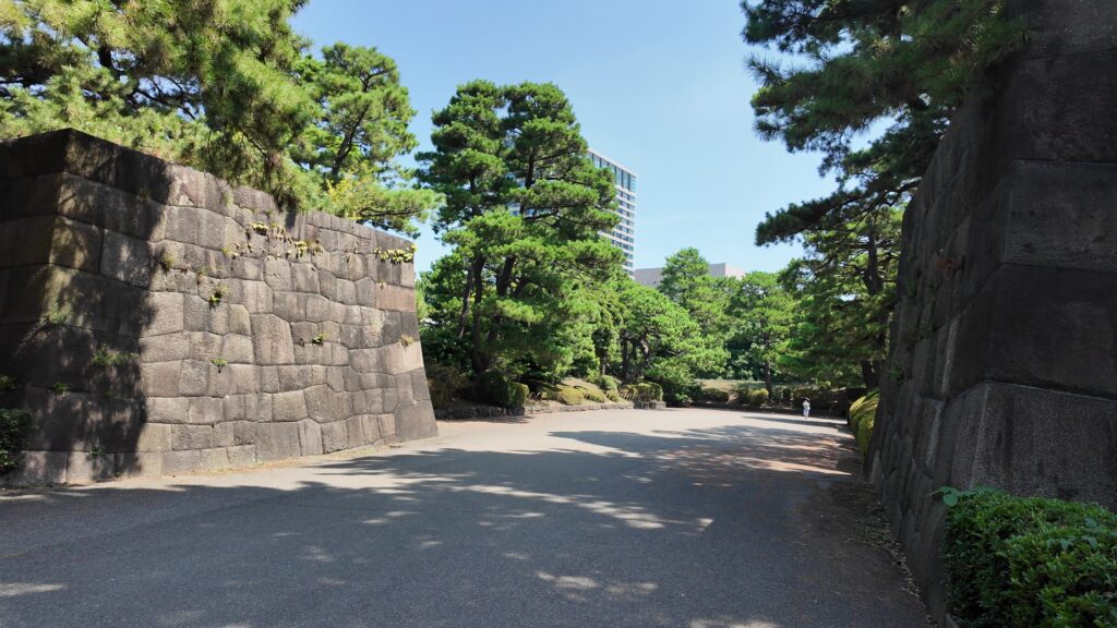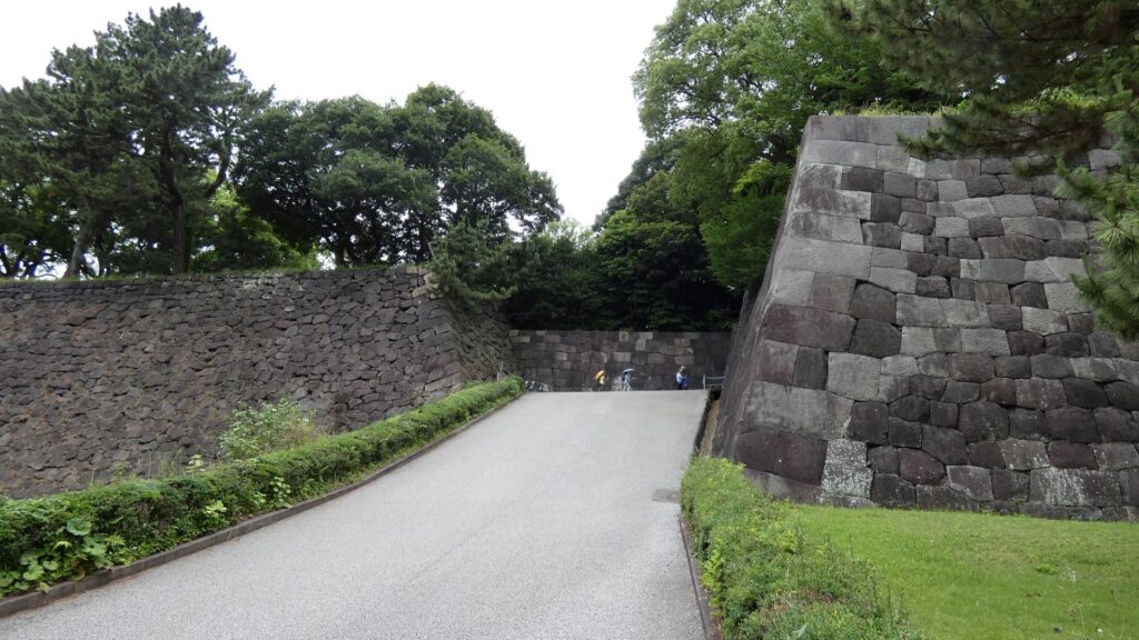 ここは本丸の出入口の一つで、太田道灌が梅を植えたことにちなむと言われる、梅林坂です。江戸城の中でも、特に歴史が古い所です。ここから下って、本丸の周りを歩きましょう。