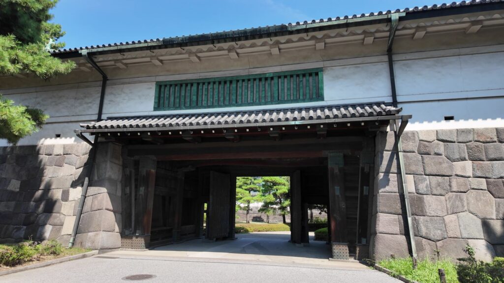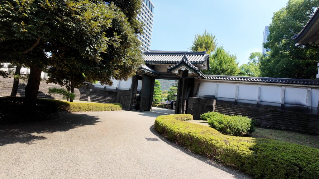 現在の三の丸は、宮内庁などの建物がある場所になっています。次の関門は、大手三の門の跡です。大名も駕篭から降りなければならなかった場所です。ここから先が二の丸なのですが、かつては、この前に堀がありました。横を見ると、堀と櫓群が並ぶ光景が広がっていたのです。門の中には、同心番所が残っています。新しめの三つ葉葵の瓦がありますが、元は菊の御紋だったのが、この場所を公開するときに、わざわざ取り替えたそうです。。同心番所がある場所もまた、枡形になっています。